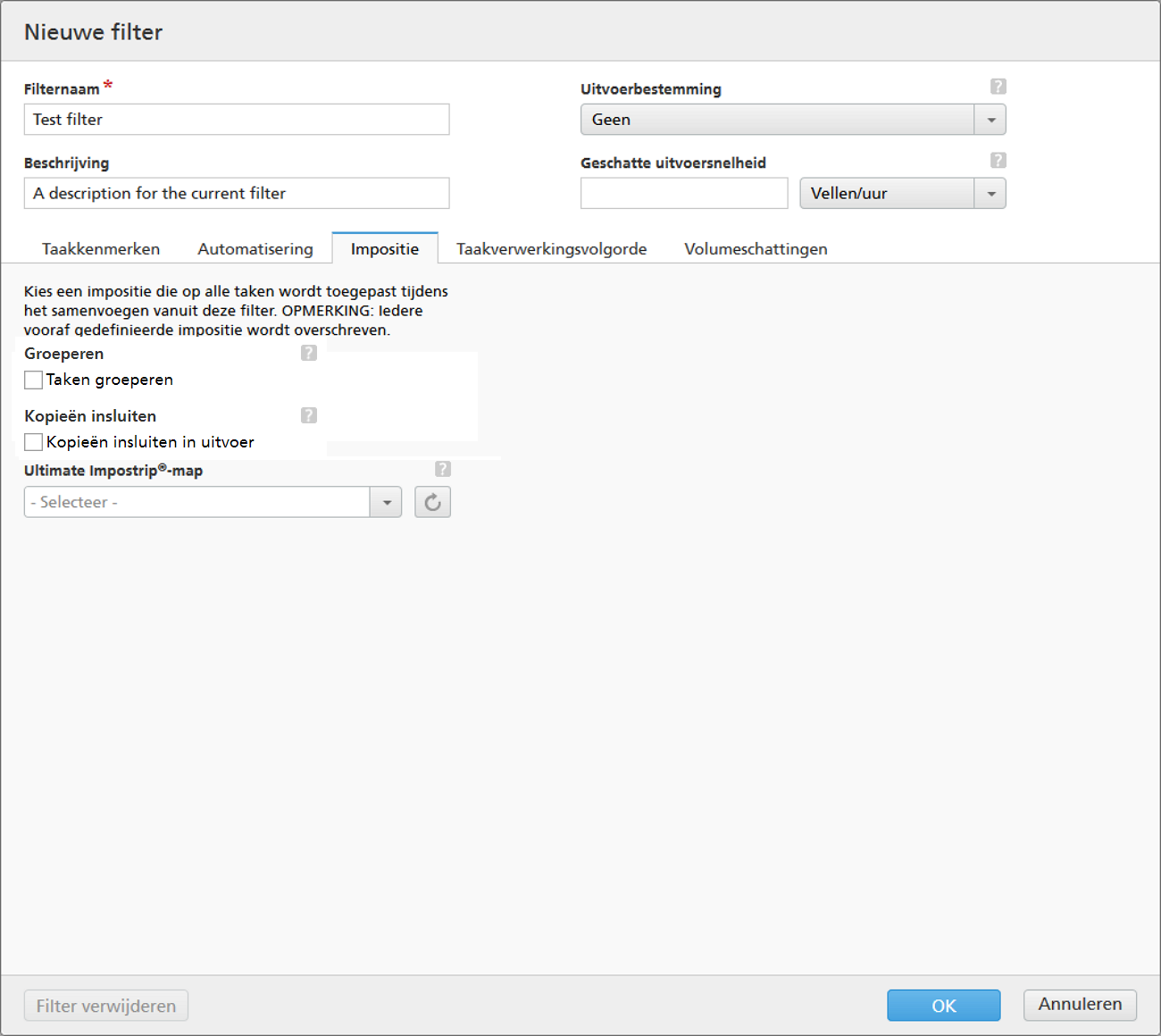 Voer 1 tot 256 tekens in. | Specificeert de beschrijving van de impositie. |